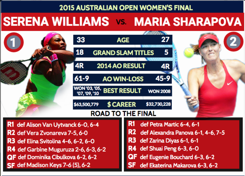 Серена Уильямс перед финалом: «Мария полностью заслужила право играть в финале. Она продолжает своё выступление на турнире по той причине, что является настоящим бойцом и никогда не сдаётся. Завтра будет новая игра. Мы обе будем испытывать давление. Я уже не раз побеждала в Мельбурне, но у неё тоже есть победа. Для меня предстоящий матч не будет вопросом жизни или смерти. Такой подход позволит мне играть более расслабленно. А вот Шараповой будет нечего терять, так что поединок обещает стать весёлым. Для всего женского тенниса здорово, что в финале будут играть первая и вторая ракетки мира. Для нас с Марией это тоже хорошо. Мне действительно нравится играть с Марией. В начале соревнований я играла не лучшим образом, но сейчас всем довольна»
