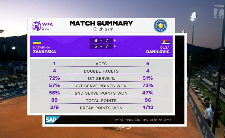 Теннисистки провели на корте 2,5 часа. Завацкая не удержала отрыв с брейком в первом сете (5-3) и во втором (3*-2). На счету украинки 3 брейка, у Данилович — 4.
