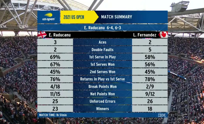 Через несколько минут игра возобновилась, Радукану, помимо текущего, отыграла ещё один брейк-поинт и успешно подала на победу в матче. На турнире в Нью-Йорке британка не проиграла ни одного сета и стала первым «квалифаером», которой удалось выиграть титул Большого Шлема.