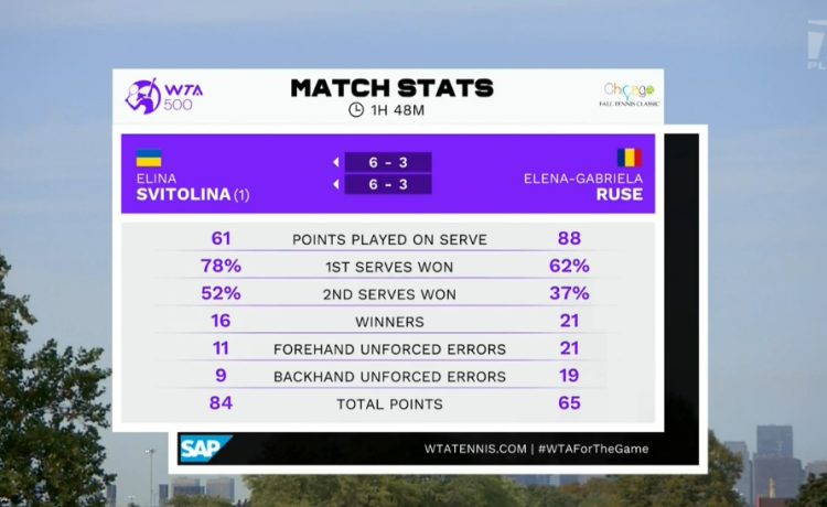 Матч продолжался 1 час и 48 минут. На счету Свитолиной 4 брейка, на своей подаче украинка проиграла один гейм. По ходу матча румынка обращалась за помощью к физио.
