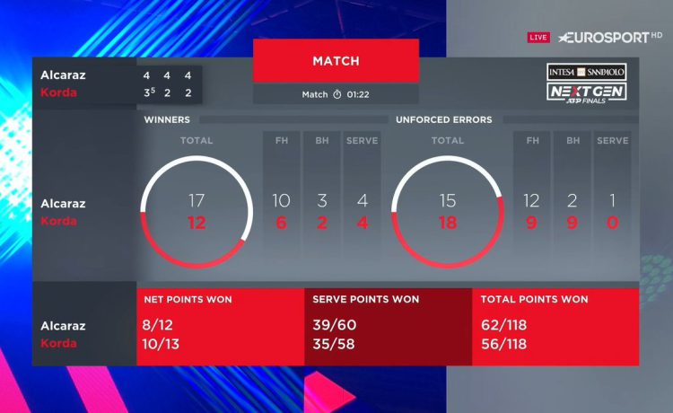 18-летний Карлос Алькарас (АТР 32) оформил 5 победу на турнире и за все матчи в Милане отдал своим соперникам только один сет. 21-летний Себастьян Корда (АТР 39) дошел до решающего поединка с 4 победами в активе (проиграл 4 сета на пути в финал). Для теннисистов это был первый очный матч.