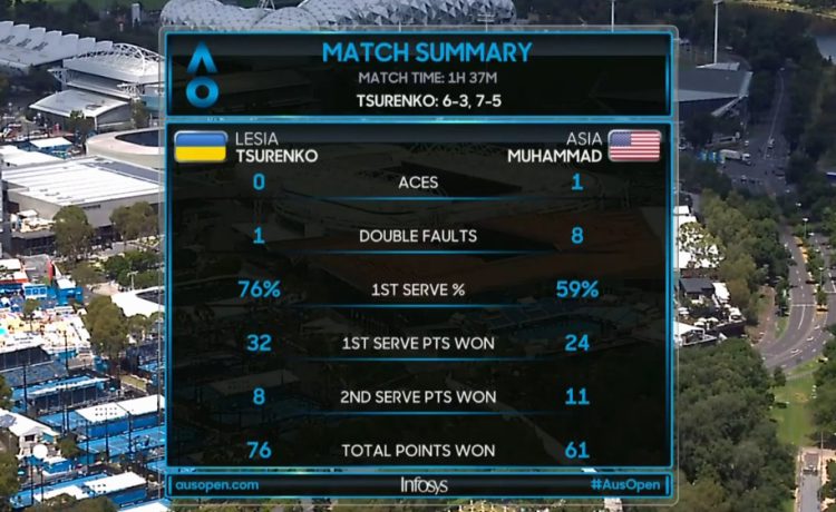 Теннисистки провели на корте около 1,5 часа. Цуренко выполнила 5 брейков и проиграла 3 гейма на своей подаче.
