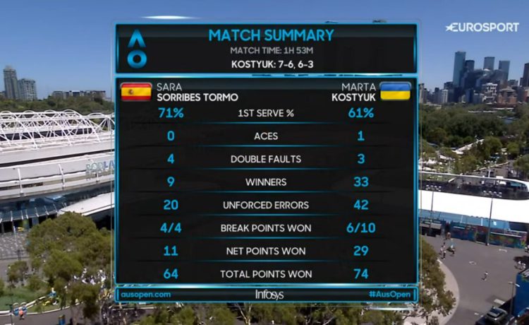 Марта Костюк (Украина) — Сара Соррибес-Тормо (Испания, 32) 7-6(5), 6-3