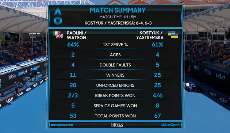 Марта Костюк/Даяна Ястремская (Украина) — Жасмин Паолини/Хезер Уотсон (Италия/Великобритания) 6:4, 6:3