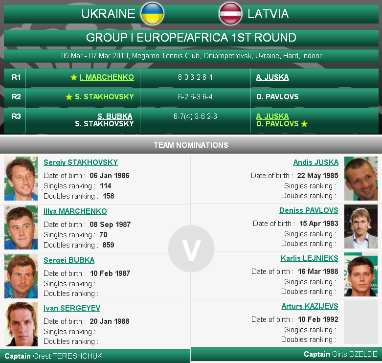 В первый день два очка в актив украинцев приносят Илья Марченко и Сергей Стаховский, а во второй день соревнований победу в парном матче празднуют латыши. Таким образом, в последний день борьбы интрига еще жива. Кто вышел победителем из этого матчевого противостояния, вы также сможете узнать на следующей неделе.