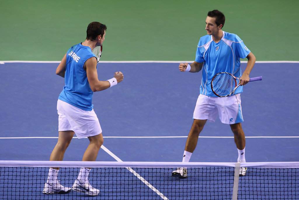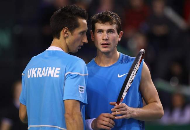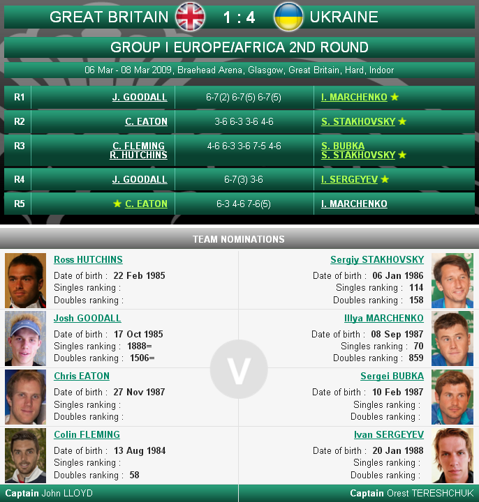 После побед Ильи Марченко и Сергея Стаховского в стартовый день соревнований, «сине-желтые» одолели хозяев и в парном поединке. В упорном пятисетовом матче против Росса Хатчинса и Колина Флеминга сильнее оказались Сергей Стаховский и Сергей Бубка. Тем самым, украинцы получили право выступить в плей-офф Мировой группы.