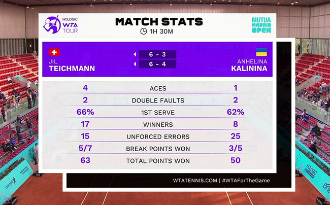 Калинина впервые сыграла в четвертьфинале турнира WTA1000. В предыдущих трёх раундах в Мадриде украинка обыграла чемпионок турниров Большого Шлема: Слоан Стивенс (US Open-2017), Гарбинье Мугурусу (Ролан Гаррос-2016, Уимблдон-2017) и Эмму Радукану (US Open-2021).