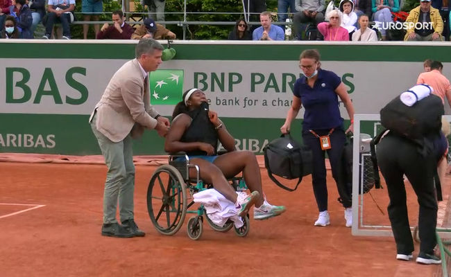 Во время розыгрыша в концовке первого сета американка подвернула ногу. Покинуть корт теннисистка смогла только на коляске с помощью персонала.