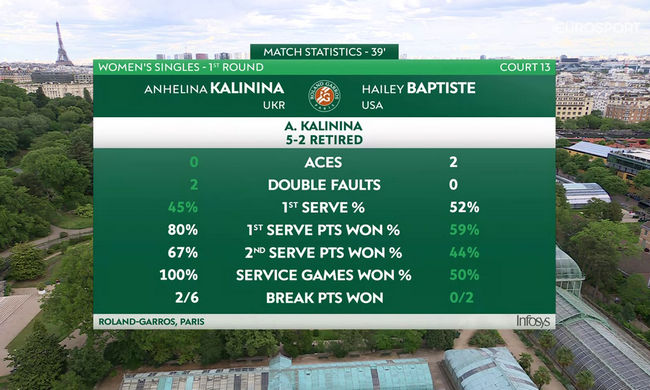 Ангелина Калинина (Украина) — Хейли Баптист (США, Q) 5:2 40-40 (отказ)