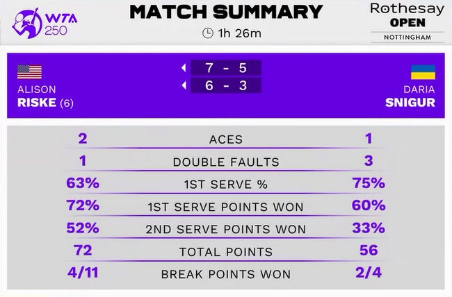 Дарья Снигур (Украина, Q) — Элисон Риск (США, 6) 5:7, 3:6