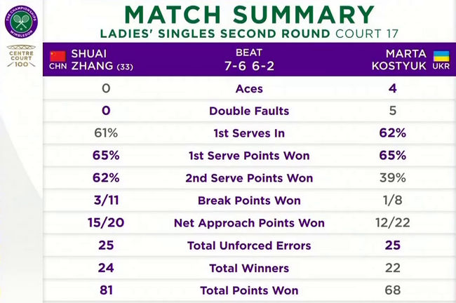 Костюк впервые за три встречи уступила Чжан Шуай: в прошлом сезоне она обыграла китаянку на травяном турнире в Истборне и на харде в Индиан-Уэллс. Марта второй сезон подряд проиграла во втором круге Уимблдона.
