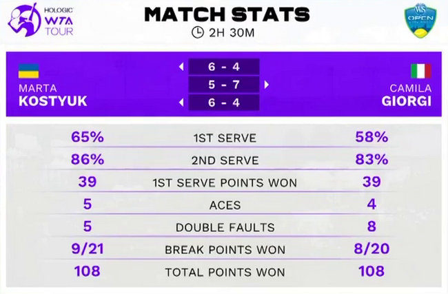 Марта Костюк (Украина, Q) — Камила Джорджи (Италия) 6:4, 5:7, 6:4