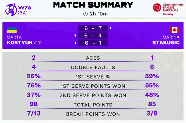 Марта Костюк (Украина, 10) — Марина Стакушич (Канада, Q) 6:7(3), 6:4, 6:1