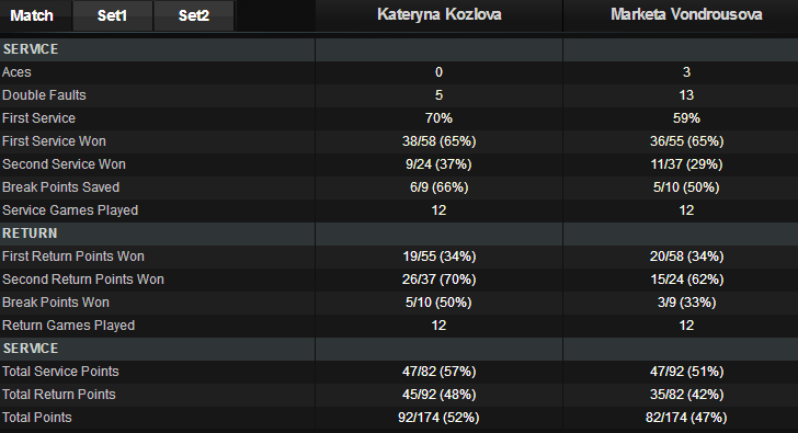 Катерина Козлова (Украина, 1) — Маркета Вондроушова (Чехия) 7-5 7-5
