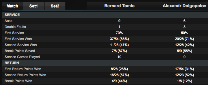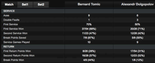 Украинец в матче второго круга (первый Долгополов пропустил получив четвертый номер посева) за 1 час 06 минут уступил 49-му номеру мирового рейтинга Бернарду Томичу из Австралии: 1-6 5-7. На счету Александра шесть подач навылет, три двойные ошибки и один реализованный брейк-пойнт. Благодаря победе Томич сократил отставание в личных встречах с Долгополовым — 3-5.