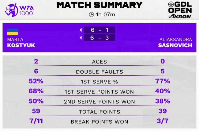 Украинская теннисистка в шестой раз в карьере удачно начала выступление в основной сетке турнира WTA 1000. Костюк ранее не проходила дальше второго раунде на таком уровне.