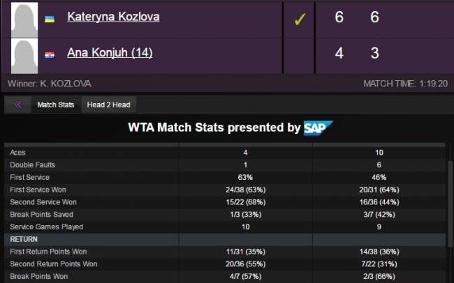 В стартовом поединке украинка нанесла поражение четырнадцатой сеянной отборочного турнира, хорватской теннисистке Ане Конюх: 6-4 6-3. За время матча, который продолжался 1 час 19 минут, Козлова четыре раза подала навылет, допустила одну двойную ошибку и реализовала четыре брейк-пойнта из семи на подаче соперницы.