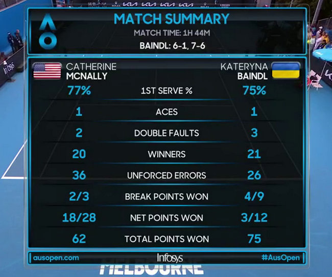 Украинская теннисистка в пятый раз сыграла на стадии второго круга на уровне «мэйджоров» и одержала первую победу. В целом для Байндл это 20-е выступление в основной сетке турниров Большого Шлема и пятое на Australian Open, где она ни разу не проходила дальше первого раунда.