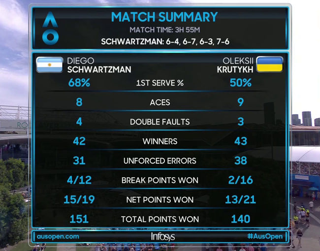 Крутых провёл свой первый матч в основной сетке турнира Большого Шлема. Также для украинца это была третья встреча с представителем топ-50 рейтинга. В предыдущих двух он также потерпел поражение. Отметим, Шварцман сегодня прервал свою восьмиматчевую безвыигрышную серию.