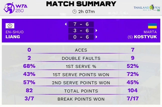Марта Костюк (Украина, 5) — Лян Эньшуо (Китайский Тайбэй, Q) 6:7(7), 6:3, 6:0