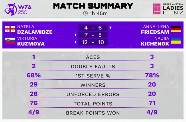 Надежда Киченок/Анна-Лена Фридсам (Украина/Германия) — Натела Дзаламидзе/Виктория Кужмова (Грузия/Словакия) 6:4, 5:7, 10-12