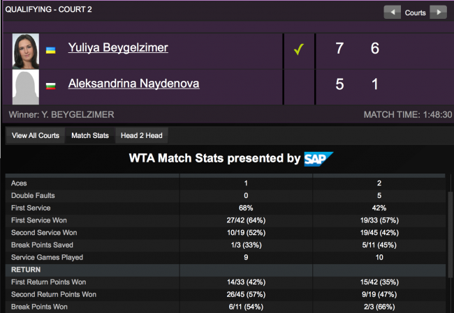 Сегодня за 1 час 48 минут, Бейгельзимер нанесла поражение болгарской теннисистке Александрине Найденовой: 7-5 6-1 и таким образом вышла в основную сетку престижного турнира. За время поединка украинка один раз подала навылет, обошлась без двойных ошибок и реализовала шесть брейк-пойнтов из одиннадцати на подаче соперницы.