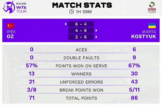 Марта Костюк (Украина, WC) — Ипек Оз (Турция, WC) 4:6, 6:4, 6:2