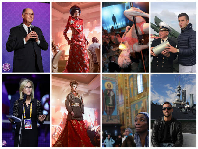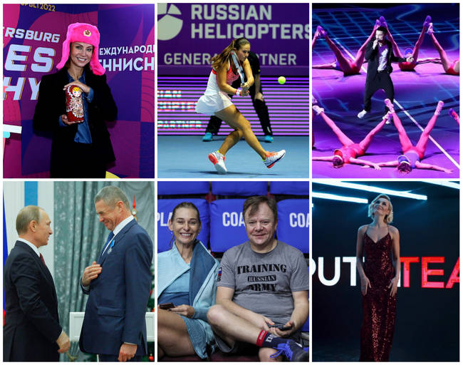 На фото: Ива Майоли на турнире в Санкт-Петербурге, Александр Медведев получает государственную награду от Владимира Путина (2014 год), логотип «Вертолеты России» на корте; музыкант и путинист Игорь Бутман в футболке «Тренировка. Российская армия» на турнире для VIP-гостей и звезд тенниса, участники Putin Team Полина Гагарина и Дима Билан, выступавшие на закрытии турниров в Санкт-Петербурге.