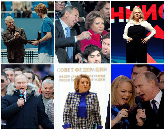 Кроме Дмитрия Медведева Кубок Кремля в октябре 2014 года без проблем посетила председатель Совета Федерации Федерального собрания Российской Федерации Валентина Матвиенко, бывшая руководительница Федерации тенниса Санкт-Петербурга (на следующем коллаже ее фото в центре вместе с другими гостями турнира – певцами Олегом Газмановым и Ларисой Долиной). Напомним, что за полгода до этого 1 марта Совет Федерации разрешил президенту Путину использовать российские войска в Украине.