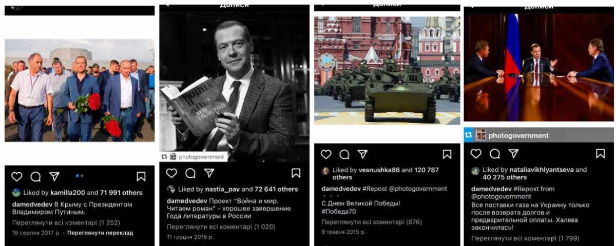 Страница Кремля в Инстаграмме уже удалена, а страница Медведева до сих пор существует. «Лайки» от игроков его визитам в Крым или чаепитию в компании Путина, предупреждения Украине относительно газа, парады военной техники и т.д. хоть и не свидетельствуют о понимании всей геополитики, но в общих чертах должны давать понимание, кто управляет их государством и в каком направлении его ведет.