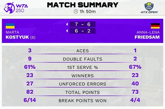На тай-брейке первого сета Костюк уступала со счётом 5-3, после чего выиграла пять из следующих шести розыгрышей. Украинка одержала вторую победу над Фридсам. В 2020 году теннисистки встречались в первом раунде квалификации турнира WTA 250 в Праге.