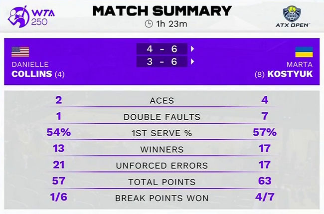 В первом сете все решил единственный брейк, который украинка смогла сделать в седьмом гейме, отыграв перед этим четыре брейк-поинта на своей подаче. Во второй партии Костюк три раза выиграла подачу Коллинс и проиграла одну свою.