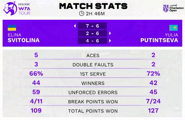 Элина Свитолина и Юлия Путницева в девятый раз сыграли друг с другом на профессиональном уровне и в третий раз победу одержала Путинцева, прервав серию из шести поражений в матчах со Свитолиной.