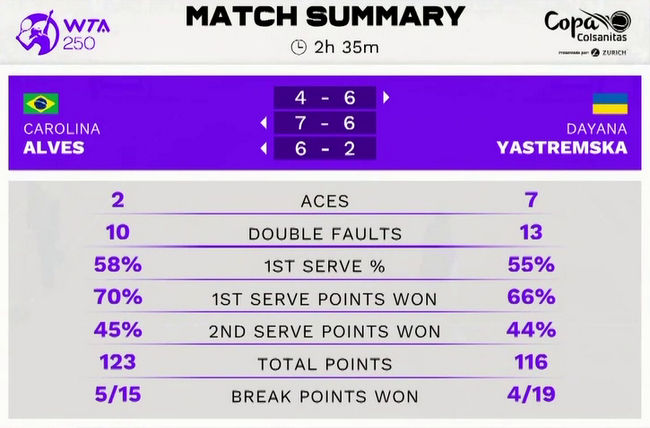 Отметим, бразильянка в четвёртый раз в карьере выступает в основной сетке турнира WTA и одержала первую победу. Ястремская в последний раз проигрывала сопернице, которая не входит в топ-200 рейтинга, в феврале прошлого года, когда не смогла обыграть Анну Далинину в квалификации турнира WTA 500 в Дубае.