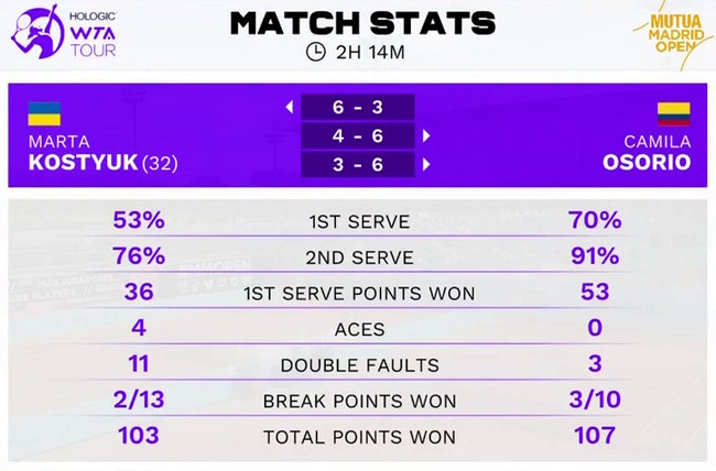 Марта Костюк (Украина, 32) — Камила Осорио (Колумбия, WC) 6:3, 4:6, 3:6