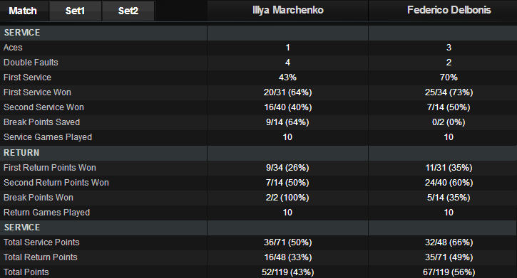 Далее события развивались уже быстрее: со счета 2-1 соперники обмениваются брейками, а Дельбонису удается еще два раза взять геймы на подаче Марченко. За 1 час и 32 минуты третий сеяный оформляет путевку в четвертьфинал.