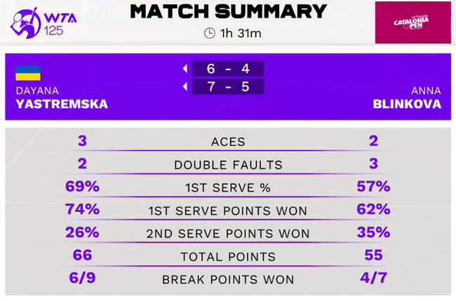 Во втором сете Ястремская упустила преимущество, ведя со счётом 5:2, однако после этого выиграла следующие два гейма. Украинка впервые с июня прошлого года сыграет в четвертьфинале: тогда она дошла до этой стадии на турнире WTA 250 в Бирмингеме.
