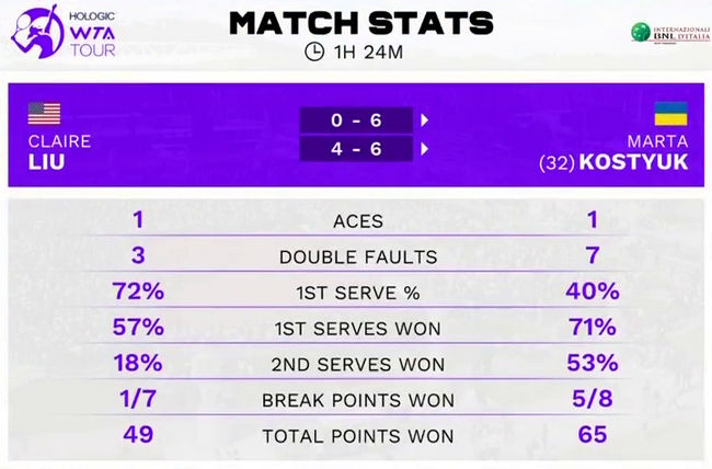 Марта Костюк третий раз сыграла против Клэр Лю и одержала вторую победу (теннисистки впервые провели поединок на грунте). Украинская теннисистка уступала 0:3 во втором сете, после чего взяла пять геймов подряд и успешно подала на матч при счете 5:4.