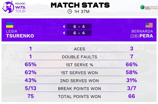 Леся в шестой раз выступает в основной сетке турнира в Риме. Ранее ей не удавалось доходить до третьего раунда.