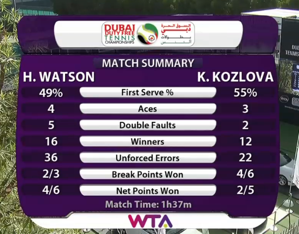 В матче первого круга, украинка попавшая в основу через квалификацию, нанесла поражение 43-й ракетке мира Хизер Уотсон из Великорбитании: 6-4 7-5. Поединок продолжался 1 час 37 минут, за которые Козлова три раза подала навылет, допустила две двойные ошибки и реализовала четыре брейк-пойнта из шести на подаче соперницы. Отметим, что Катя не проиграла ни одной партии на турнире за три матча.