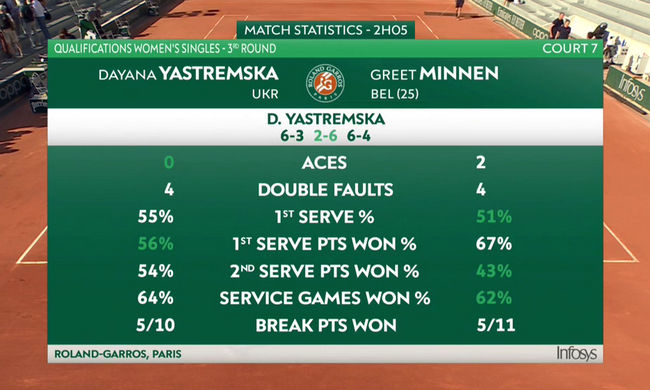 Даяна Ястремская (Украина) — Грет Миннен (Бельгия, 25) 6:3, 2:6, 6:4