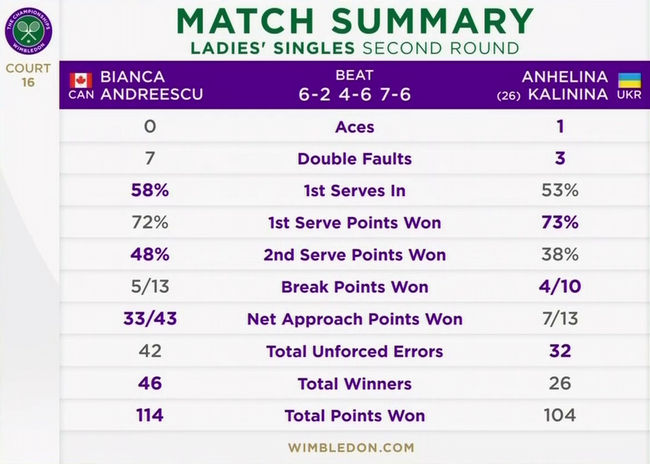 Ангелина Калинина (Украина, 26) — Бьянка Андрееску (Канада) 2:6, 6:4, 6:7(7)