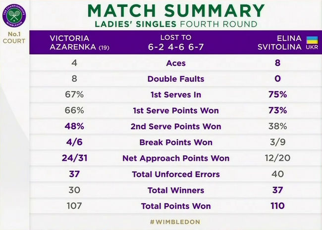 Сегодня украинка боролась за свой десятый четвертьфинал на турнирах Grand Slam, в том числе второй на Уимблдоне. В 2019 году Элине удалось дойти до полуфинала, что является её лучшим результатом на этом уровне. В том же сезоне Свитолина сыграла в 1/2 финала и на Открытом чемпионате США.