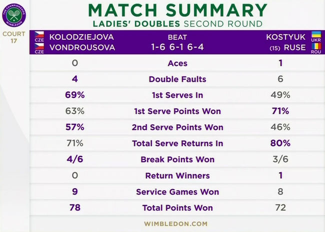 Костюк и Русе во второй раз в этом году встретились с представительницами Чехии. В январе они обыграли Колодзеёву и Вондроушову в третьем круге Открытого чемпионата Австралии.