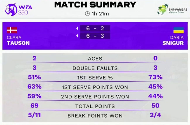 Дарья Снигур (Украина) — Клара Таусон (Дания) 2:6, 3:6