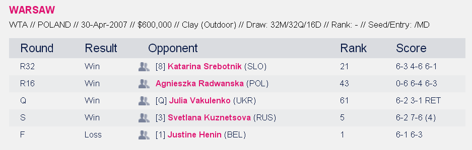 По ходу соревнований украинка праздновала победы над Катариной Среботник (8), Агнешкой Радваньской, Светланой Кузнецовой (3). В финале нашу теннисистку остановила только первая ракетка мира Жюстин Энен.