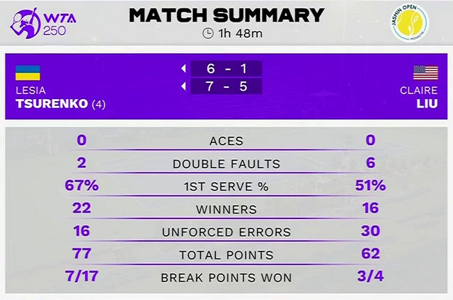 Леся Цуренко (Украина, 4) — Клэр Лю (США) 6:1, 7:5