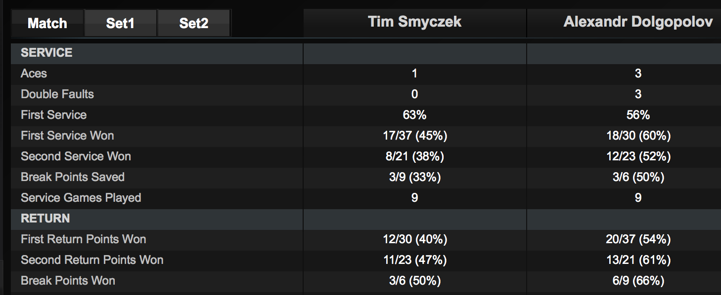 Во втором раунде, украинец за 1 час 10 минут, нанес поражение 80-му номеру мирового рейтинга Тиму Смычеку из США: 6-2 6-4. На счету Александра три подачи навылет, столько же двойных ошибок и шесть брейков. Отметим, что Долгополов впервые, в текущем сезоне, выиграл два матча подряд.