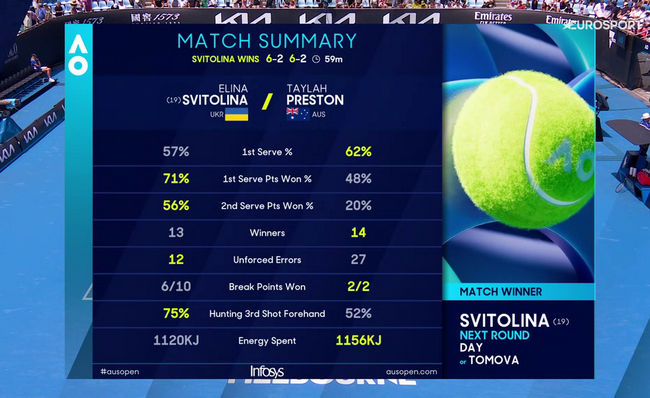 В сегодняшнем матче Элина дважды подала навылет, не допустив ни одной двойной ошибки, реализовала шесть из десяти брейк-поинтов и проиграла два гейма на собственной подаче.
