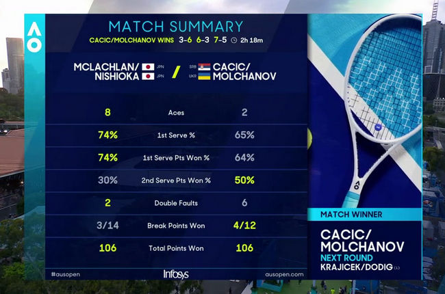 Молчанов и Чачич провели на корте почти два с половиной часа и выиграли первый совместный матч в этом году. В начале месяца теннисисты уступили на старте турнира ATP 250 в Аделаиде.